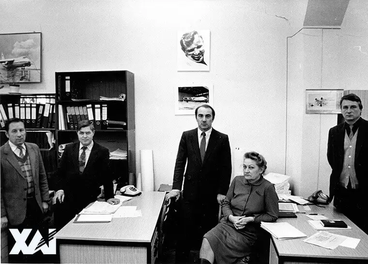 Служба провідних конструкторів по літаку Ан-225 (зліва направо): ведучий з льотних випробувань С.Бєлозеров (випускник ХАІ 1964), провідний із загальних питань Є.Друзяка (випускник ХАІ 1967), керівник А.Вовнянко, діловод І.Шуригіна, провідний за випробуванням з міцності Ю.Калашніков.