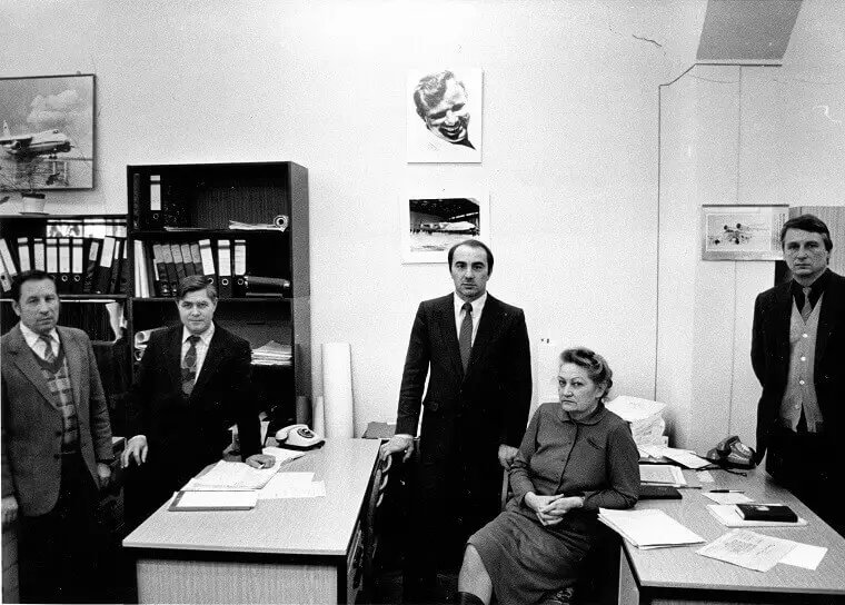 Служба провідних конструкторів по літаку Ан-225 (зліва направо): ведучий з льотних випробувань С.Бєлозеров (випускник ХАІ 1964), провідний із загальних питань Є.Друзяка (випускник ХАІ 1967), керівник А.Вовнянко, діловод І.Шуригіна, провідний за випробуванням з міцності Ю.Калашніков.