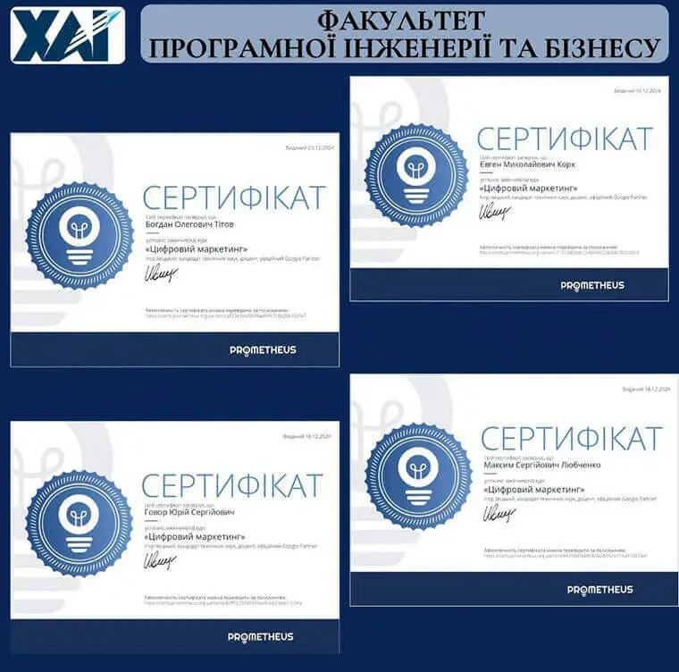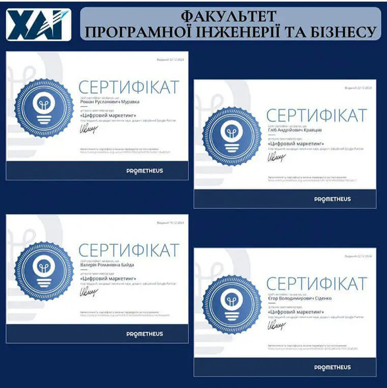 Студенти Факультету програмної інженерії та бізнесу успішно завершили сертифікований курс «ЦИФРОВИЙ МАРКЕТИНГ» на платформі PROMETHEUS. Перед цим вони вже опанували базовий курс «ОСНОВИ МАРКЕТИНГУ ТА ОБҐРУНТУВАННЯ ІТ-ПРОЄКТІВ», що стало чудовою підготовкою до поглиблення знань у сфері діджитал-маркетингу.
