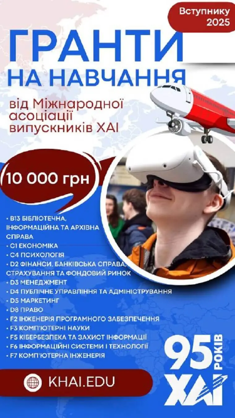 Ми раді повідомити, що за підтримки випускників університету запроваджено систему грантів від Асоціації випускників ХАІ. Грант у розмірі 10000 гривень на оплату навчання отримають усі здобувачі освіти, які цього року вступили на контрактну форму навчання за такими спеціальностями: