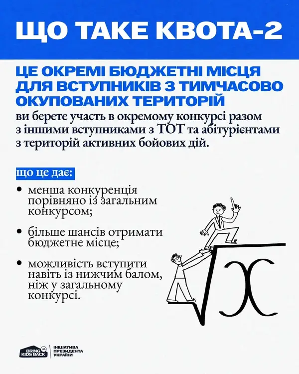 Квота-2 — це окремі бюджетні місця для вступників з ТОТ і територій активних бойових дій. Вступ відбувається в окремому конкурсі, що дає більше шансів отримати бюджет. У більшості університетів це близько 10% місць, а в переміщених або прифронтових — до 40%.