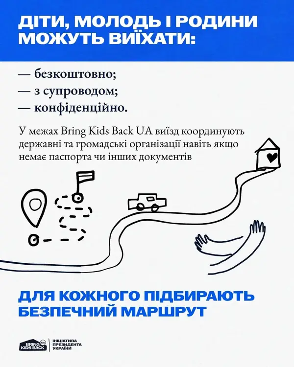 Якщо ви тільки плануєте виїзд — звертайтеся. У межах ініціативи Bring Kids Back UA допомагають виїхати безкоштовно, конфіденційно та з повним супроводом — навіть якщо немає документів. Для кожного підбирають безпечний маршрут.