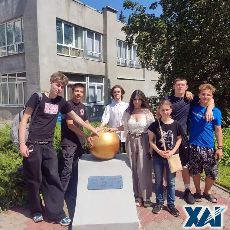 На фото — 8 серпня майбутні студенти кафедри нарисної геометрії та комп’ютерного моделювання не тільки вперше зібралися групою, а й вирушили у веселу екскурсію територією ХАІ. Пам’ятник «Шарі», Су-7Б, яблука на алеях Літакобудівного корпусу…