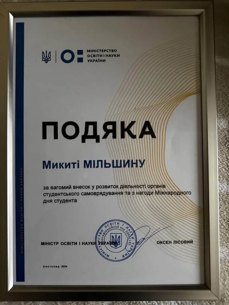 Вчора, 3 ГРУДНЯ, студенту Літакобудівного факультету ХАІ Микиті МІЛЬШИНУ було вручено ПОДЯКУ Міністерства освіти і науки України «За вагомий внесок у розвиток діяльності органів студентського самоврядування та з нагоди Міжнародного дня студентів». Подяку вручив Генеральний директор директорату фахової передвищої, вищої освіти МОН України Олег ШАРОВ.