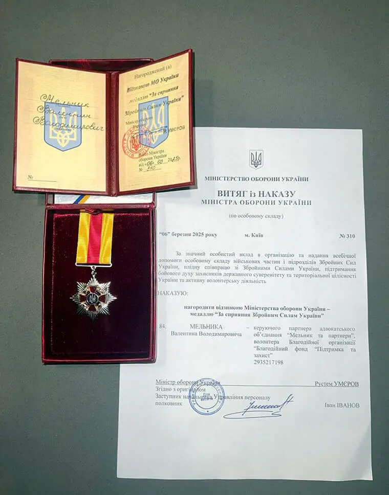 Нагородити відзнакою Міністерства оборони України – медаллю “За сприяння Збройним Силам України” Мельника Валентина Володимировича – керуючого партнера адвокатського об'єднання "Мельник та партнери”, волонтера Благодійної організації “Благодійний фонд “Підтримка та захист”.