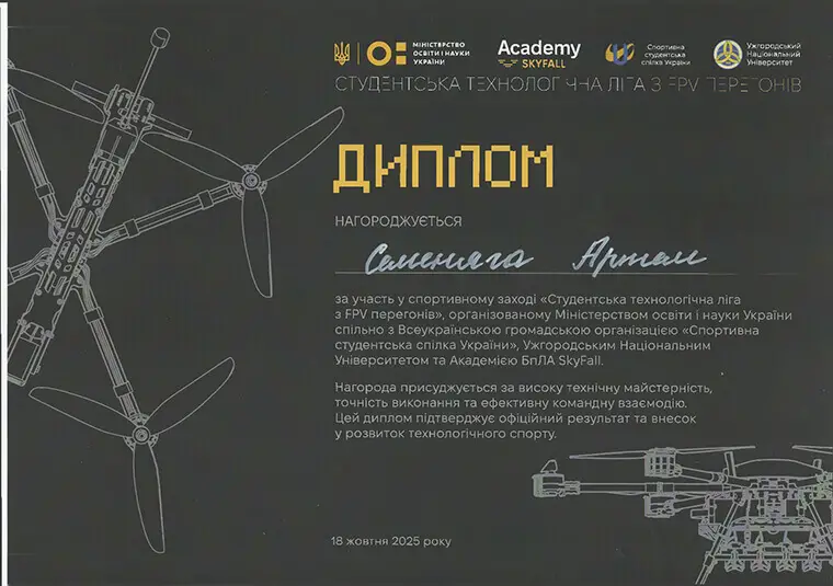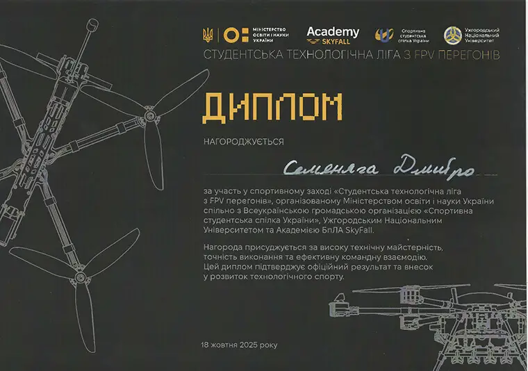 За результатами виступу команда ХАІ отримала дипломи від МОН України та Академії SkyFall, підтвердивши свій внесок у розвиток технологічного спорту й інженерної освіти.
