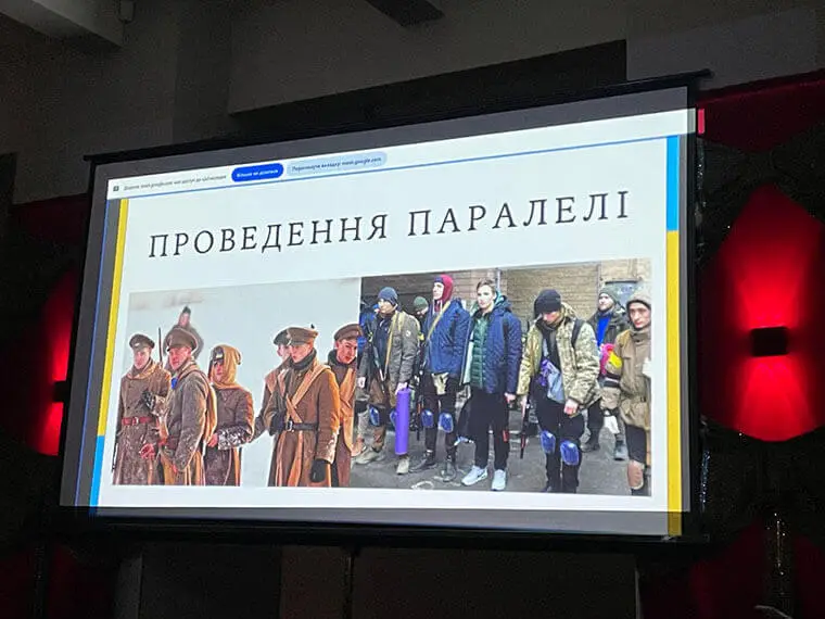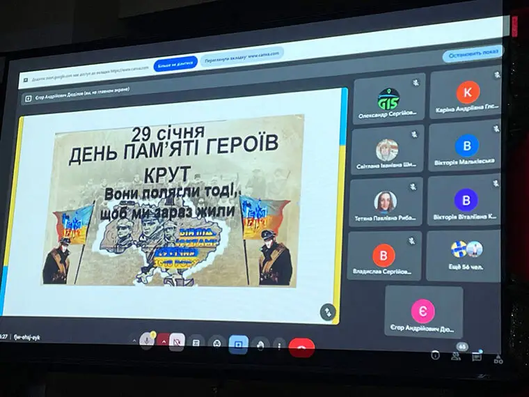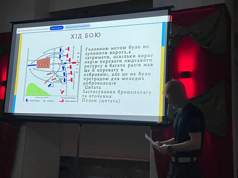Історичні паралелі того періоду історії України з подіями сьогодення зрозумілі кожному. Саме тому героїчний бій, що 107 років тому прийняли студенти, юнкера та гімназисти, сприймається не сторінкою з підручника історії, а дороговказом від минулих поколінь, прикладом любові та шани до нашої Батьківщини. Наскільки ця тема важлива говорить кількість учасників заходу – понад 100 (з них 65 онлайн).
