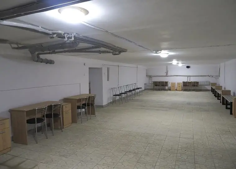 Укриття обладнано евакуаційними виходами, меблями, фільтрами очищення води, санітарною зоною (туалети, душові, пральні машини), запасами питної води, засобами гігієни, вогнегасниками, матрацами.
