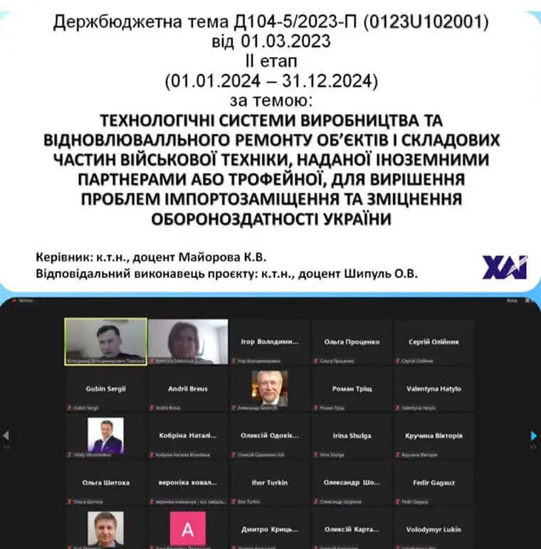 Кандидат технічних наук, доцент, завідувачка Кафедри технології виробництва літальних апаратів (104) Катерина МАЙОРОВА презентувала результати роботи за держбюджетною темою «Технологічні системи виробництва та відновлювального ремонту об'єктів і складових частин військової техніки, наданої іноземними партнерами або трофейної, для вирішення проблем імпортозаміщення та зміцнення обороноздатності України».