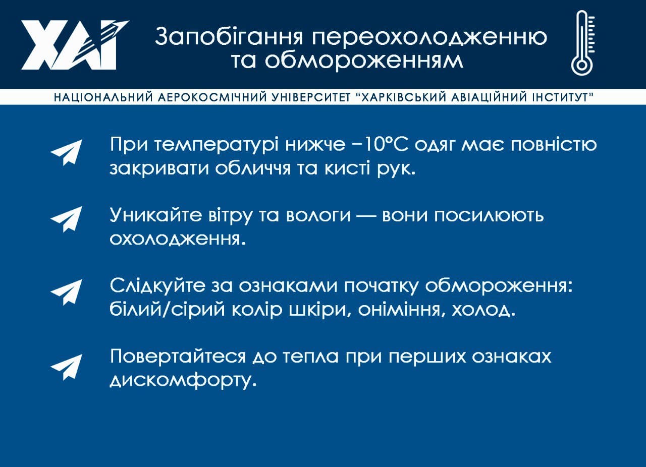 Запобігання переохолодженню та обмороженням: при температурі нижче −10 °C одяг має повністю закривати обличчя та кисті рук. Уникайте вітру та вологи — вони посилюють охолодження. Слідкуйте за ознаками початку обмороження: білий/сірий колір шкіри, оніміння, холод. Повертайтеся до тепла при перших ознаках дискомфорту.