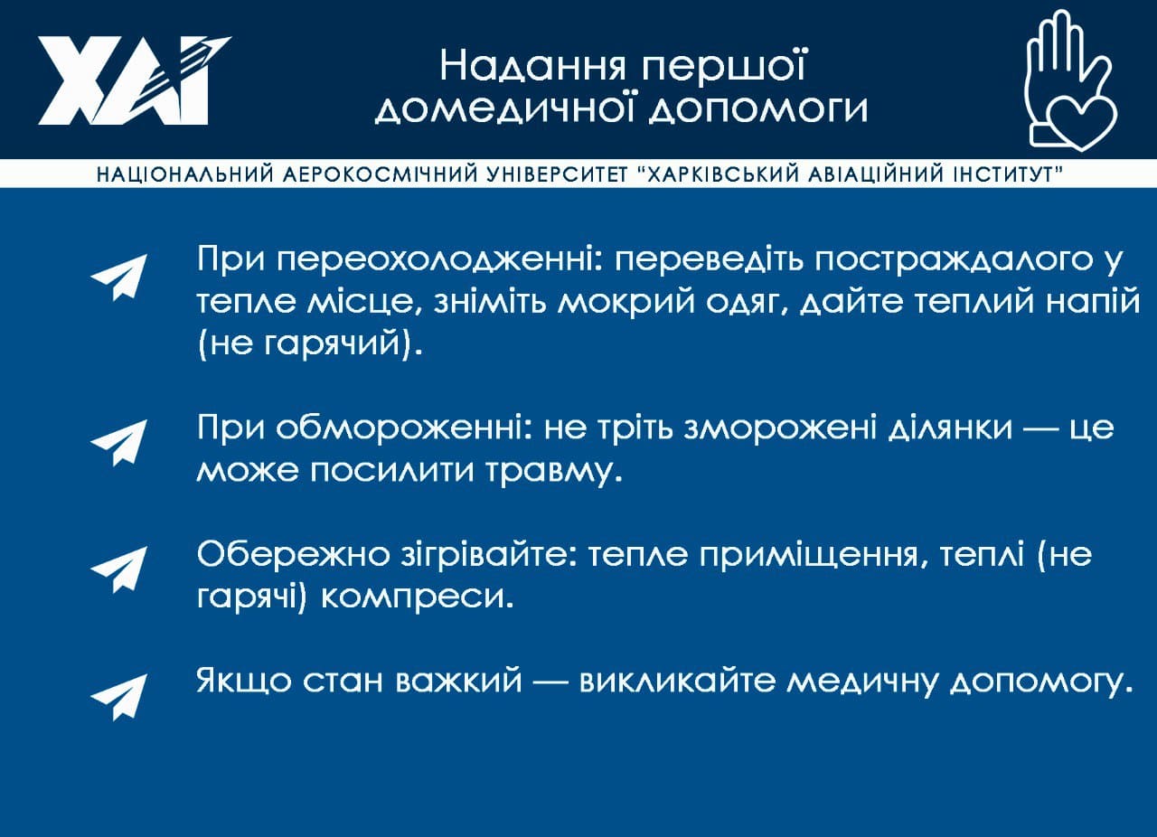 Надання першої домедичної допомоги: при переохолодженні: переведіть постраждалого у тепле місце, зніміть мокрий одяг, дайте теплий напій (не гарячий). При обмороженні: не тріть зморожені ділянки — це може посилити травму. Обережно зігрівайте: тепле приміщення, теплі (не гарячі) компреси. Якщо стан важкий — викликайте медичну допомогу.