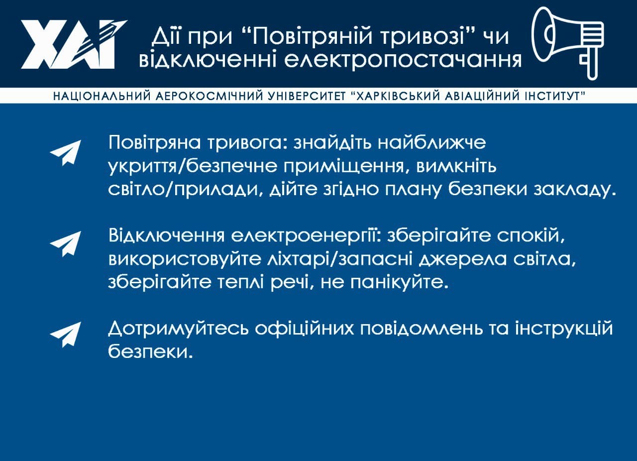 Дії при “Повітряній тривозі” чи відключенні електропостачання: повітряна тривога: знайдіть найближче укриття/безпечне приміщення, вимкніть світло/прилади, дійте згідно плану безпеки закладу. Відключення електроенергії: зберігайте спокій, використовуйте ліхтарі/запасні джерела світла, зберігайте теплі речі, не панікуйте. Дотримуйтесь офіційних повідомлень та інструкцій безпеки.