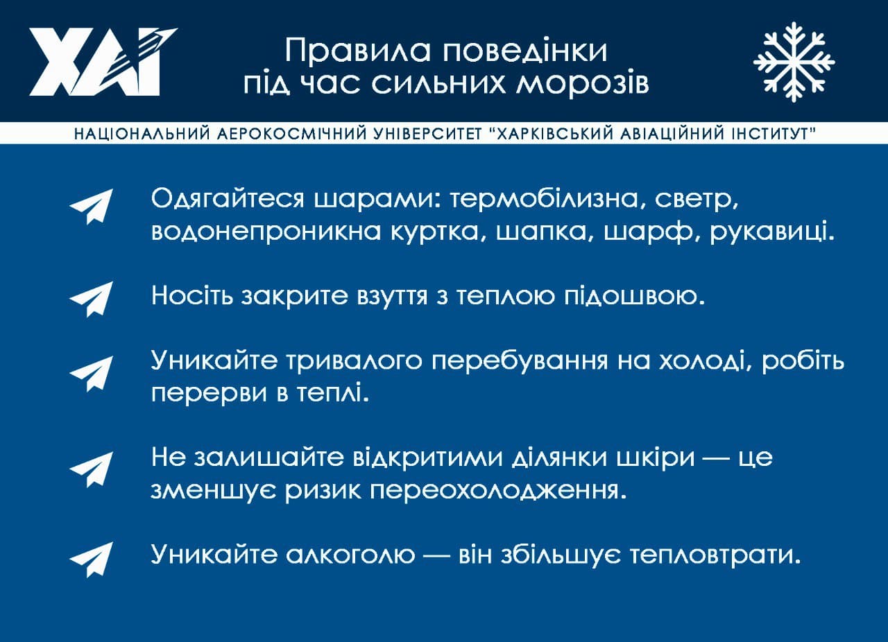 Одягайтеся шарами: термобілизна, светр, водонепроникна куртка, шапка, шарф, рукавиці. Носіть закрите взуття з теплою підошвою. Уникайте тривалого перебування на холоді, робіть перерви в теплі. Не залишайте відкритими ділянки шкіри — це зменшує ризик переохолодження. Уникайте алкоголю — він збільшує тепловтрати.