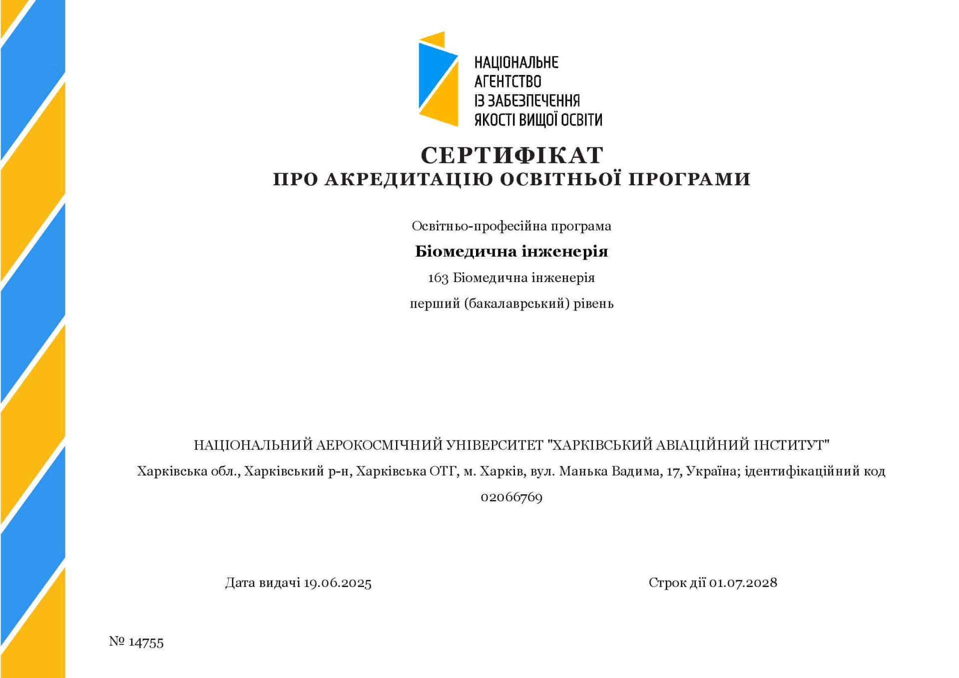 Наявність акредитації: Сертифікат про акредитацію: №14756 виданий 19 червня 2025 року. Термін дії 01 липня 2028 року. Оновлення або модернізація освітньої програми здійснюється відповідно до розділу 5 Положення «Про розроблення та модернізацію освітніх програм в ХАІ».