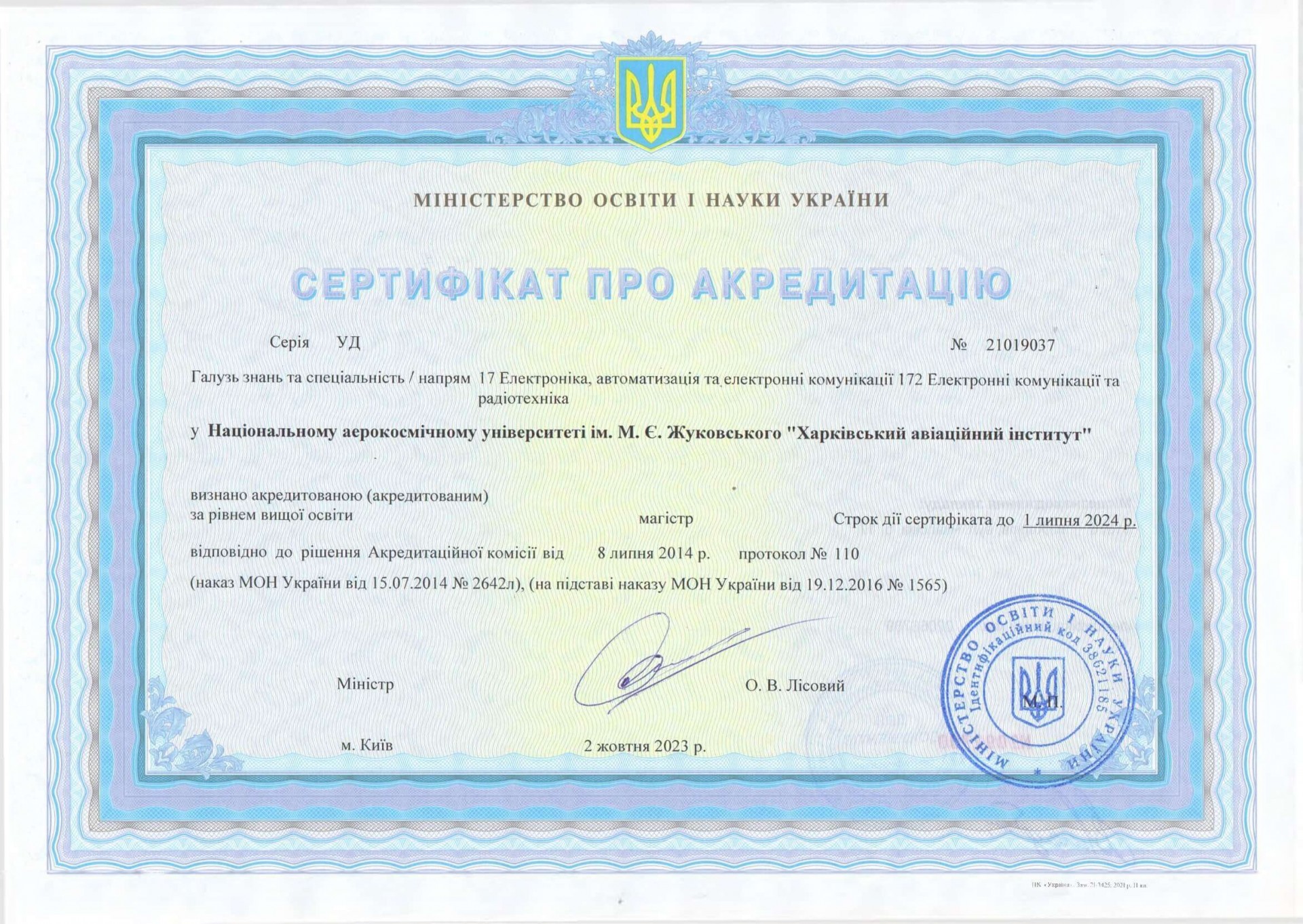 Наявність акредитації: Сертифікат про акредитацію: серія УД №21019037 від 02 жовтня 2023 року відповідно до рішення АК від 08 липня 2014 року протокол №110 (наказ МОН України від 15 липня 2014 року №2642л) (на підставі наказу МОН України від 19 грудня 2016 року №1565), дійсний до 01 липня 2026 року. Оновлення або модернізація освітньої програми здійснюється відповідно до розділу 5 Положення «Про розроблення та модернізацію освітніх програм в ХАІ».