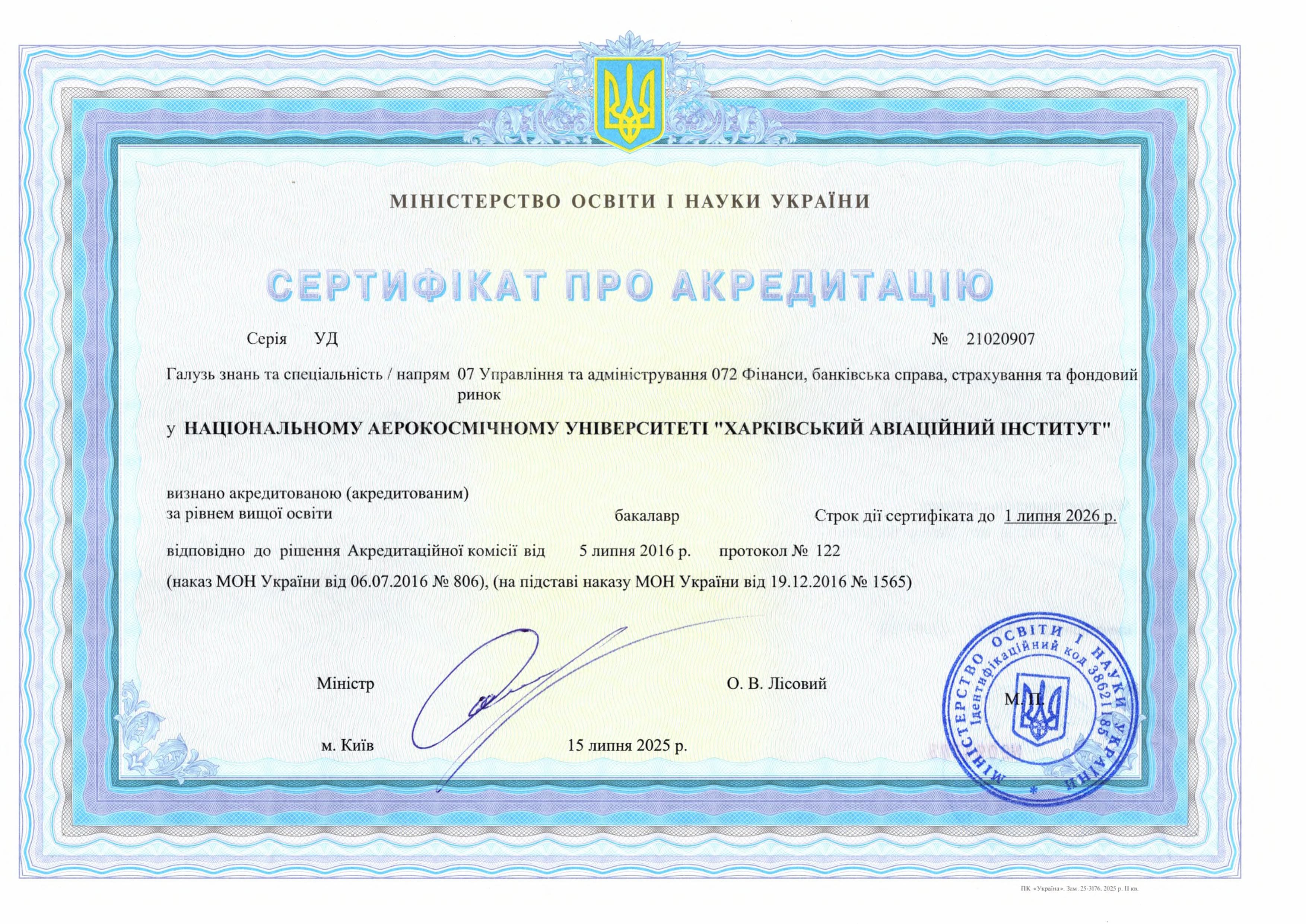 Наявність акредитації: Сертифікат про акредитацію: серія УД №21020907, виданий 15 липня 2025 року. Термін дії до 01 липня 2026 року. Оновлення або модернізація освітньої програми здійснюється відповідно до розділу 5 Положення «Про розроблення та модернізацію освітніх програм в ХІА».