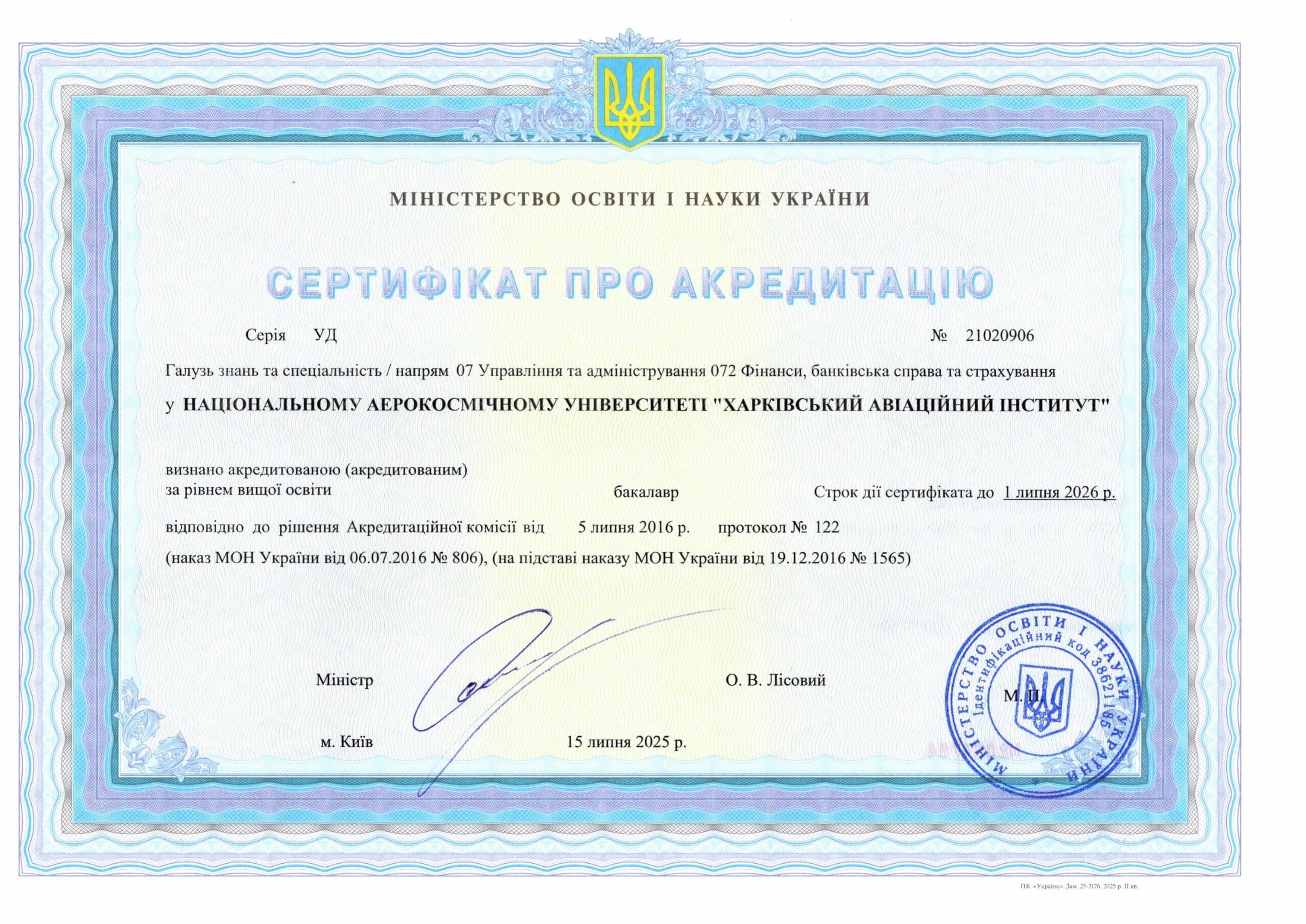 Наявність акредитації: Сертифікат про акредитацію: серія УД №21020906, виданий 15 липня 2025 року. Термін дії до 01 липня 2026 року