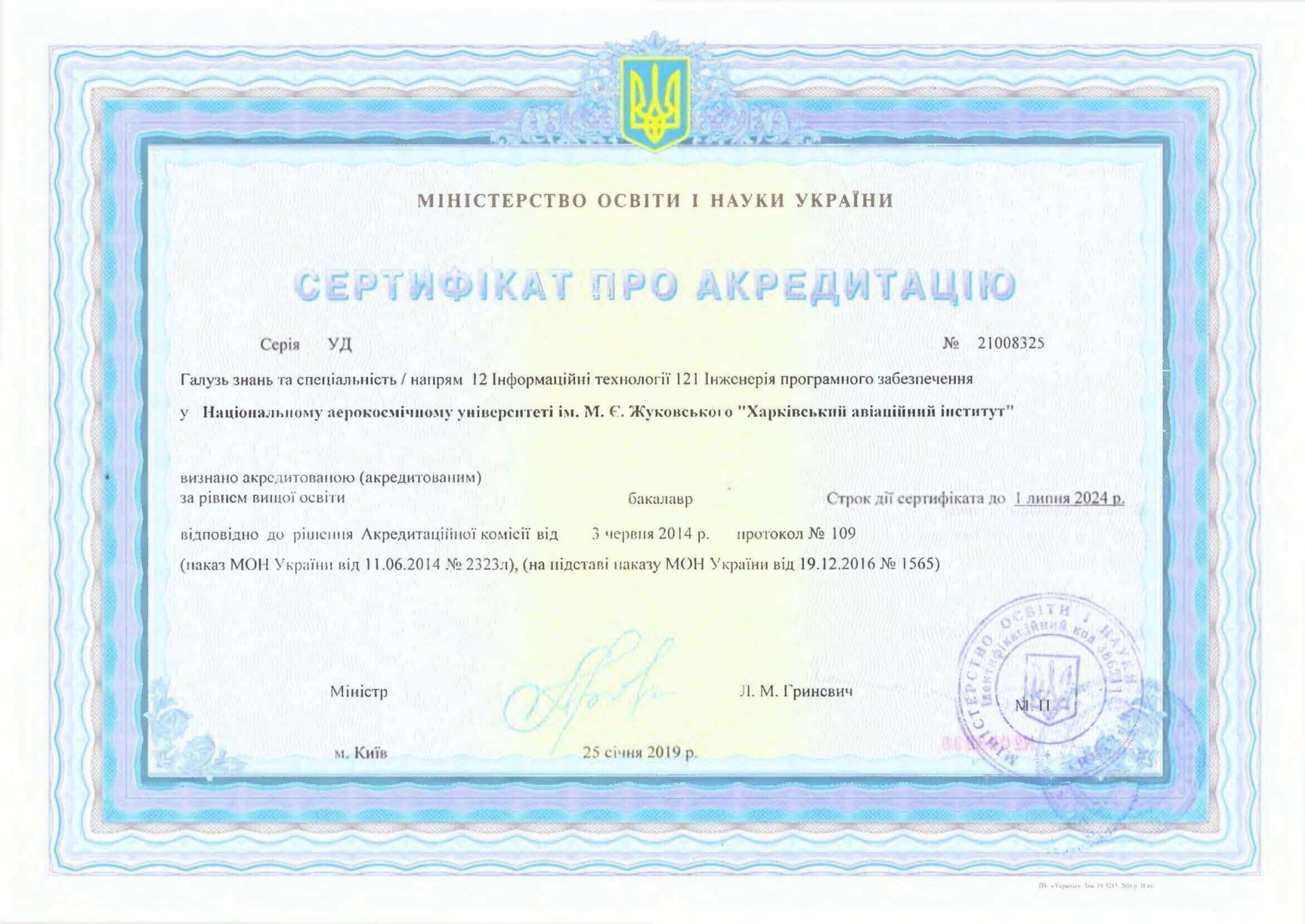 Наявність акредитації: Сертифікат про акредитацію: Серія УД № 21008325 від 25 січня 2019 року, виданий 25 січня 2019 року, протокол №109 (наказ МОН України від 11 червня 2014 року № 2323л). Термін дії до 01 липня 2026 року. Оновлення або модернізація освітньої програми здійснюється відповідно до розділу 5 Положення «Про розроблення та модернізацію освітніх програм в ХІА»