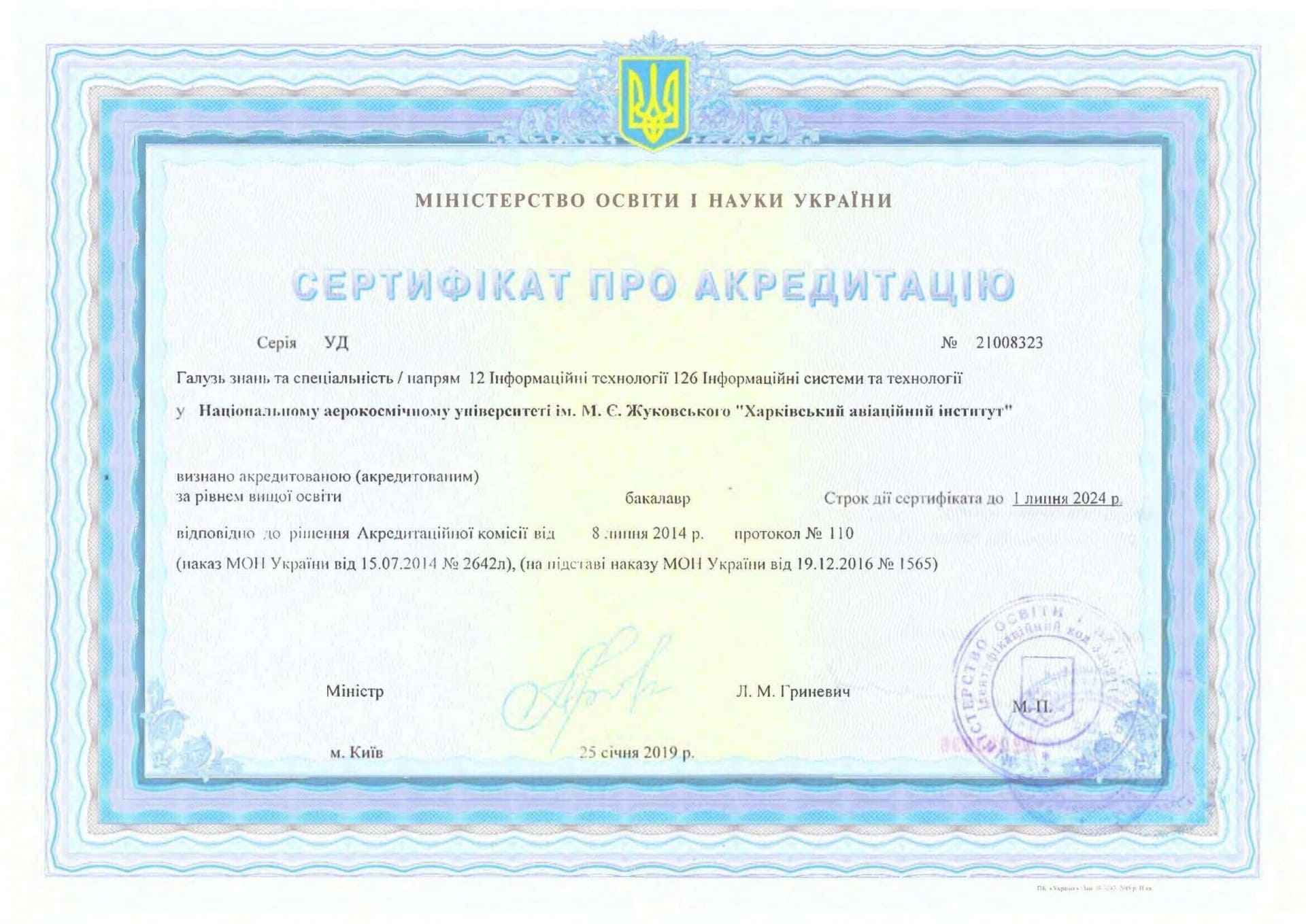 Наявність акредитації: Сертифікат про акредитацію: Серія УД №21008323 виданий 25 січня 2019 року, протокол №110 (наказ МОН України від 15 липня 2014 року №2642л). Термін дії до 01 липня 2026 року. Оновлення або модернізація освітньої програми здійснюється відповідно до розділу 5 Положення «Про розроблення та модернізацію освітніх програм в ХАІ»