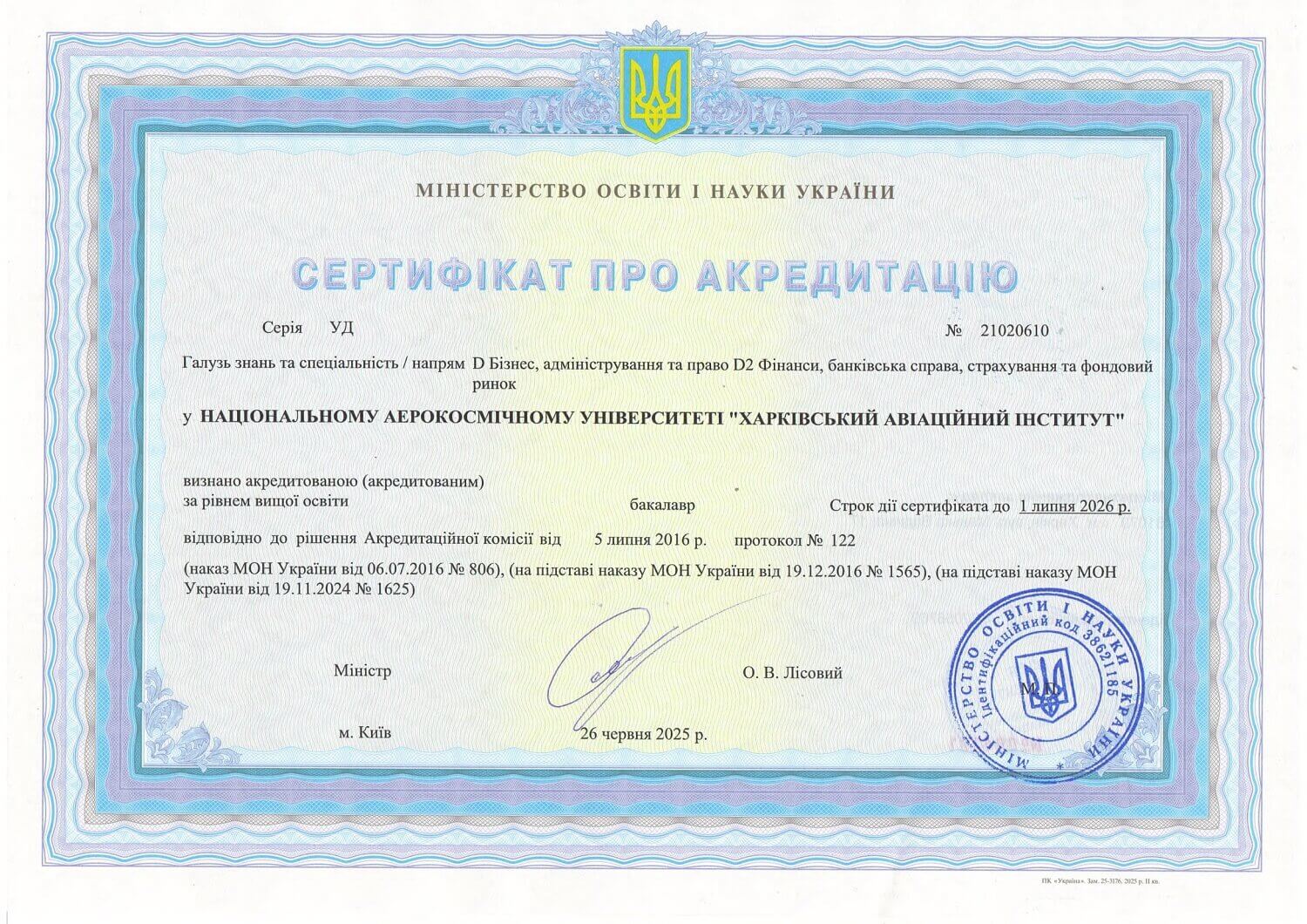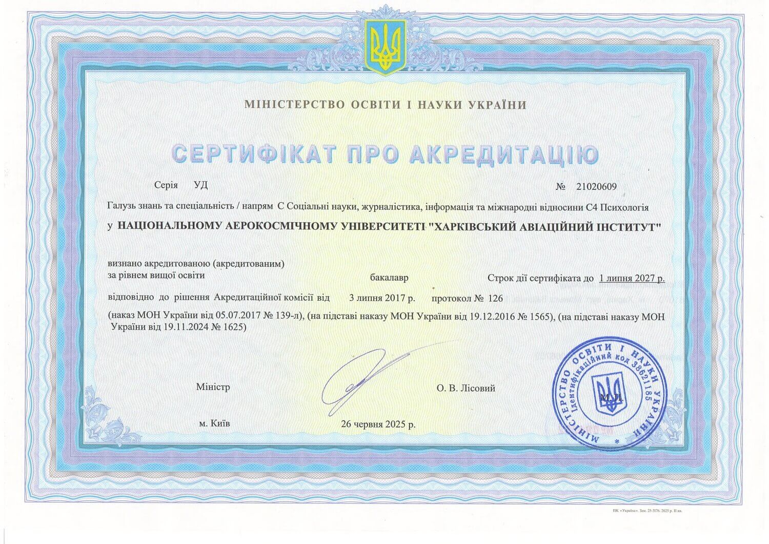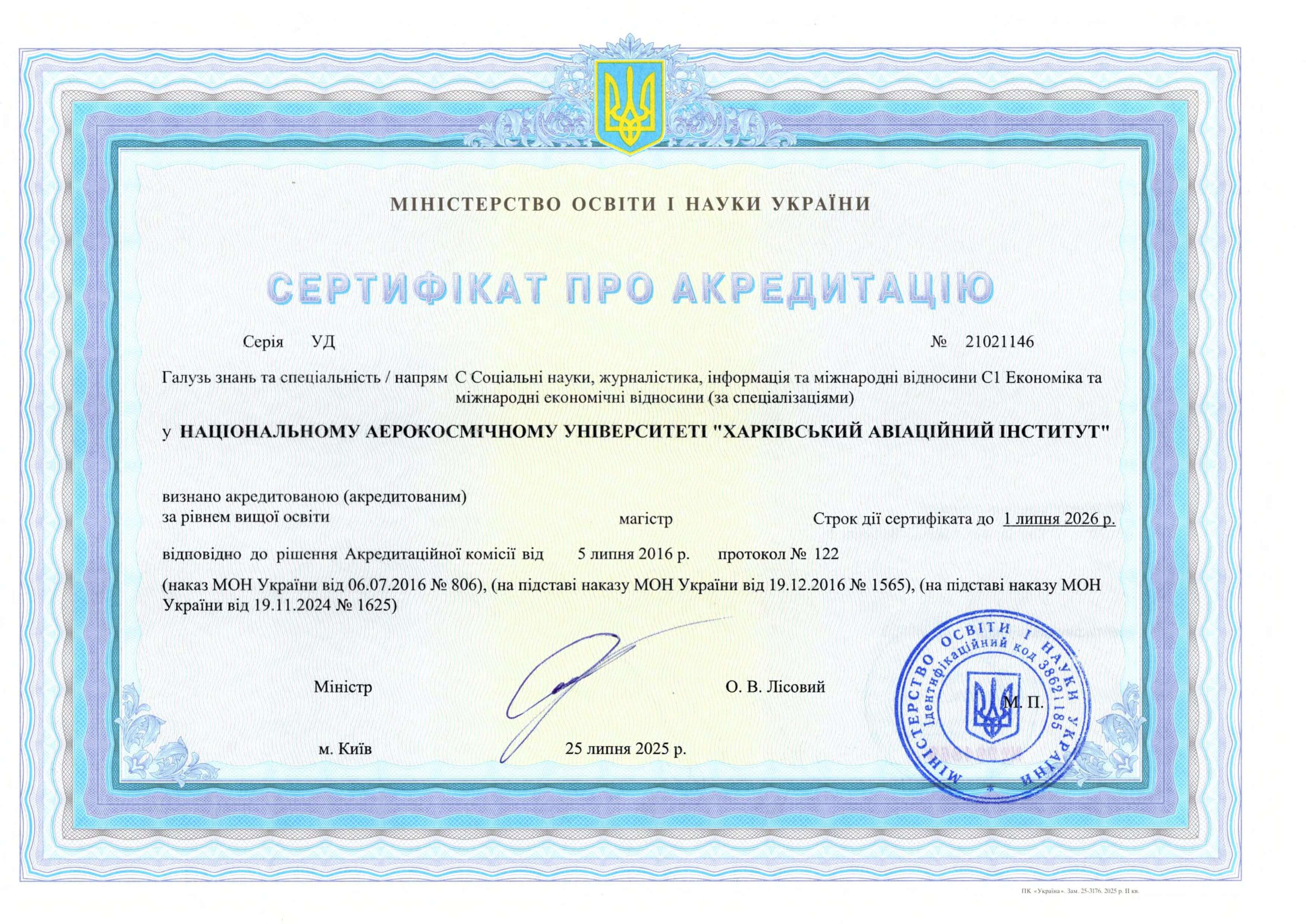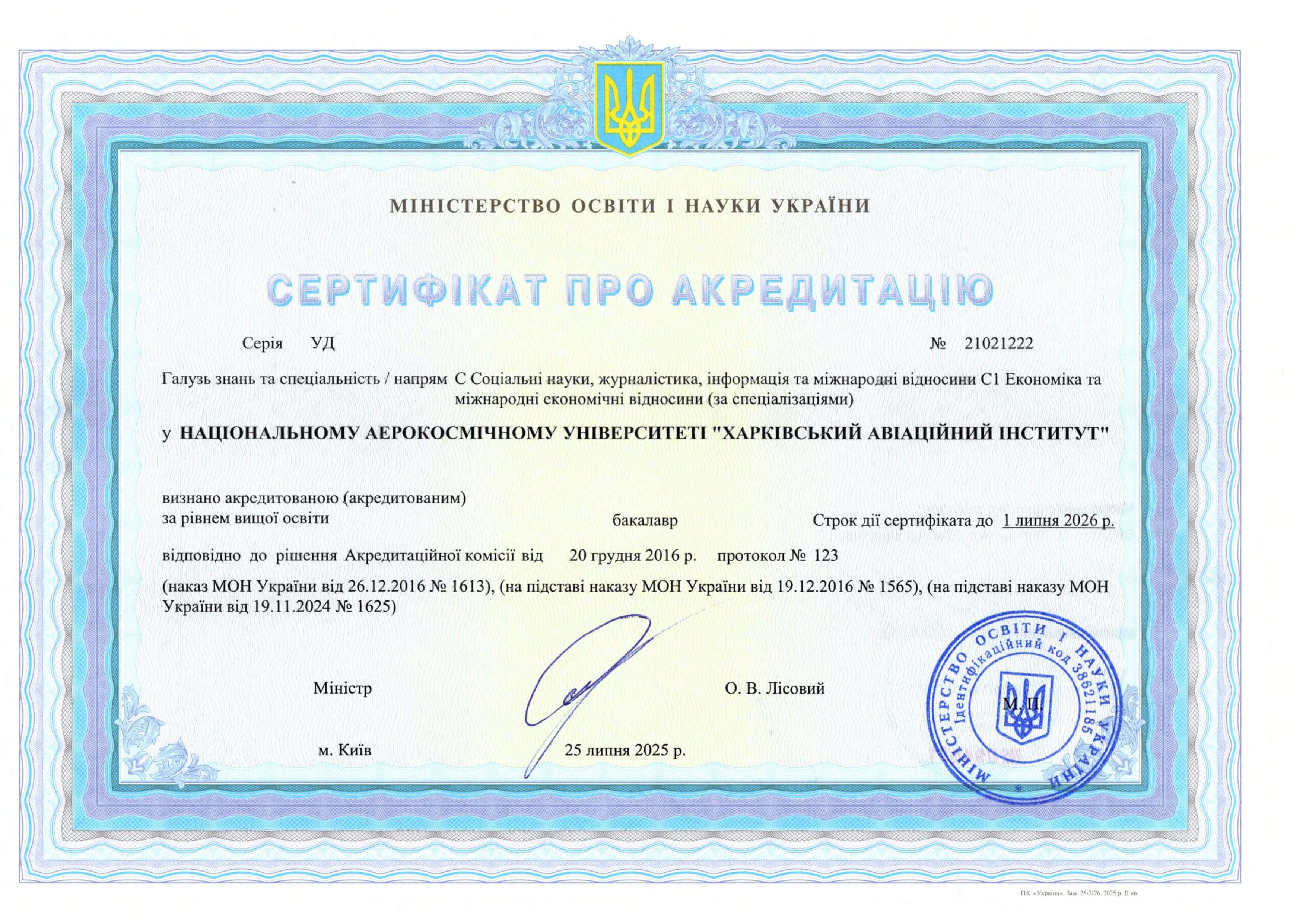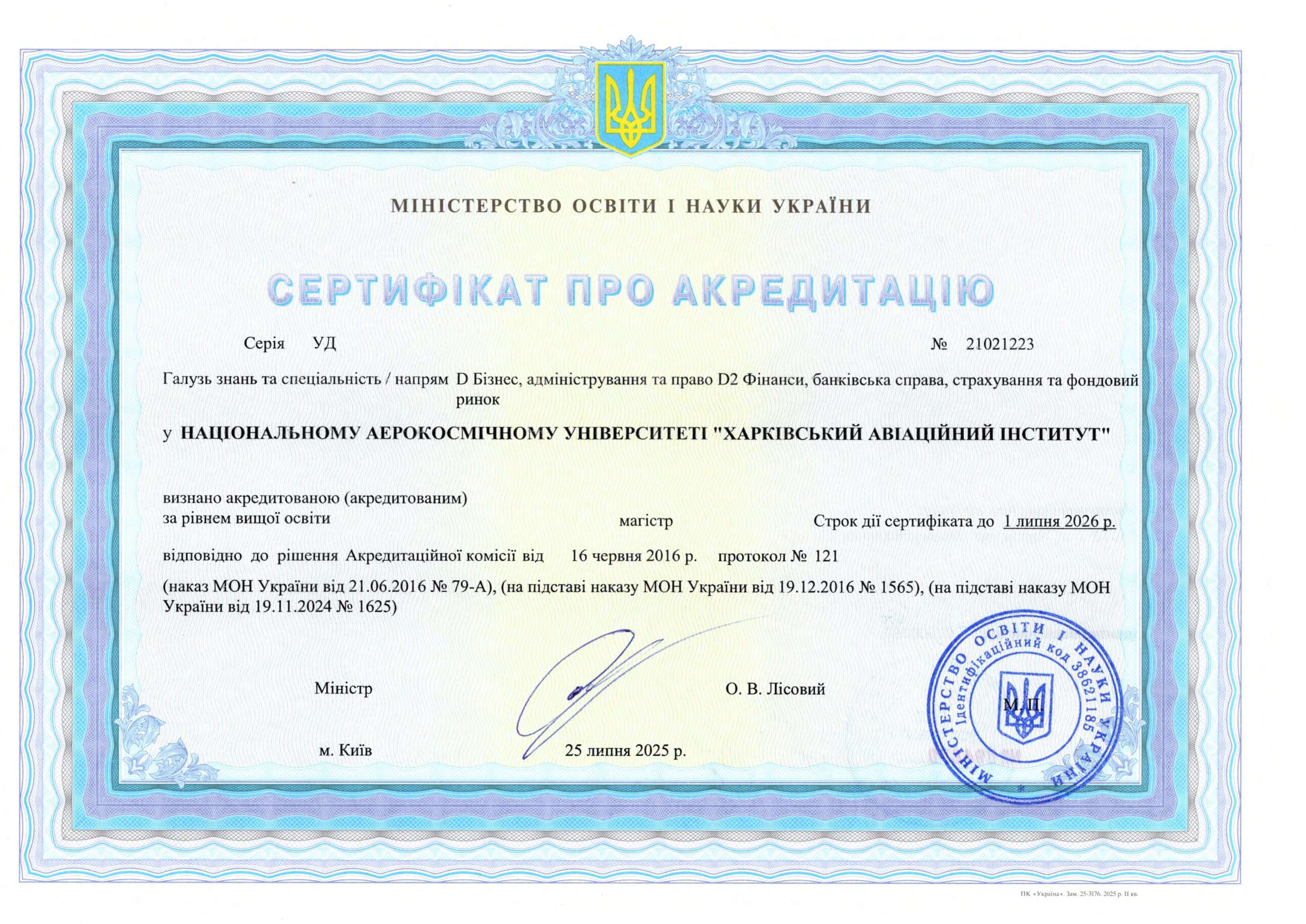 Термін дії сертифікатів про акредитацію спеціальностей/сертифікатів про акредитацію освітніх програм продовжено до 01.06.2026 р. відповідно до пункту 1 Постанови Кабінету Міністрів України «Про особливості акредитації освітніх програм, за якими здійснюють підготовку здобувачі вищої освіти, в умовах воєнного стану» від 16 березня 2022 р. № 295.