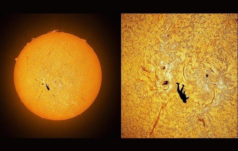 Парашутист і музикант Габріель БРАУН стрибав із мотопараплана з висоти 1070 метрів, а відстань до камери становила ще понад дві тисячі метрів. І лише мить — коли силует ідеально проходить перед сонячним диском — стала знаковим фото.