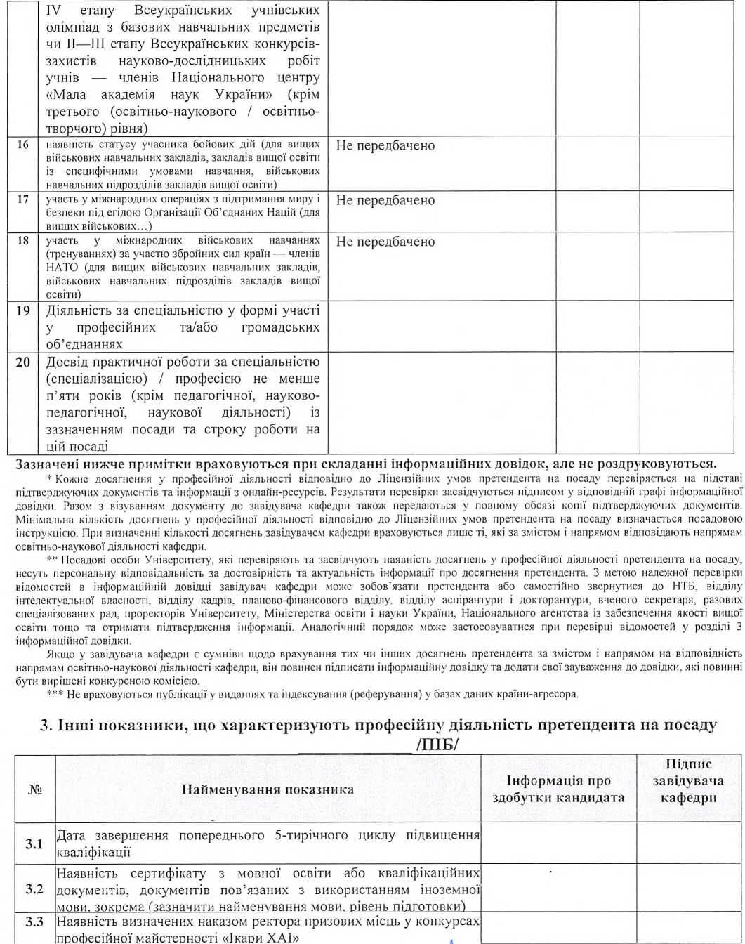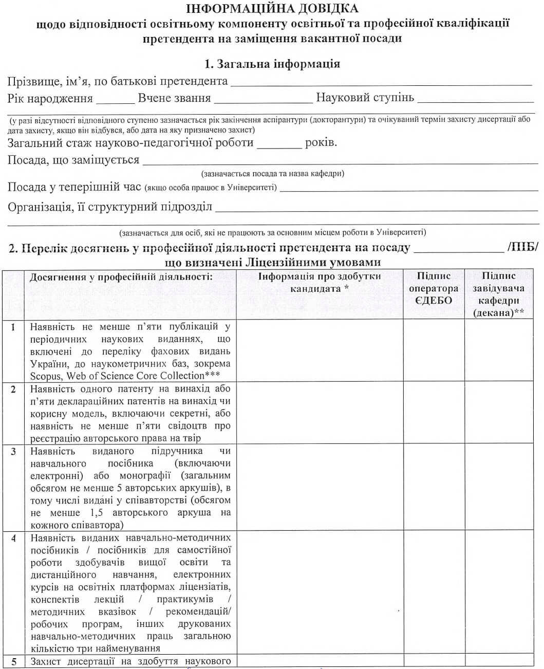 4.3. Відповідність своїх професійних досягнень вимогам Ліцензійних умов претендент на посаду науково-педагогічного працівника повинен підтверджувати складанням інформаційної довідки за формою, що наведено у додатку В цього Положення, яка засвідчує рівень освіти та кваліфікацію претендента, а також його досягнення у професійній діяльності.