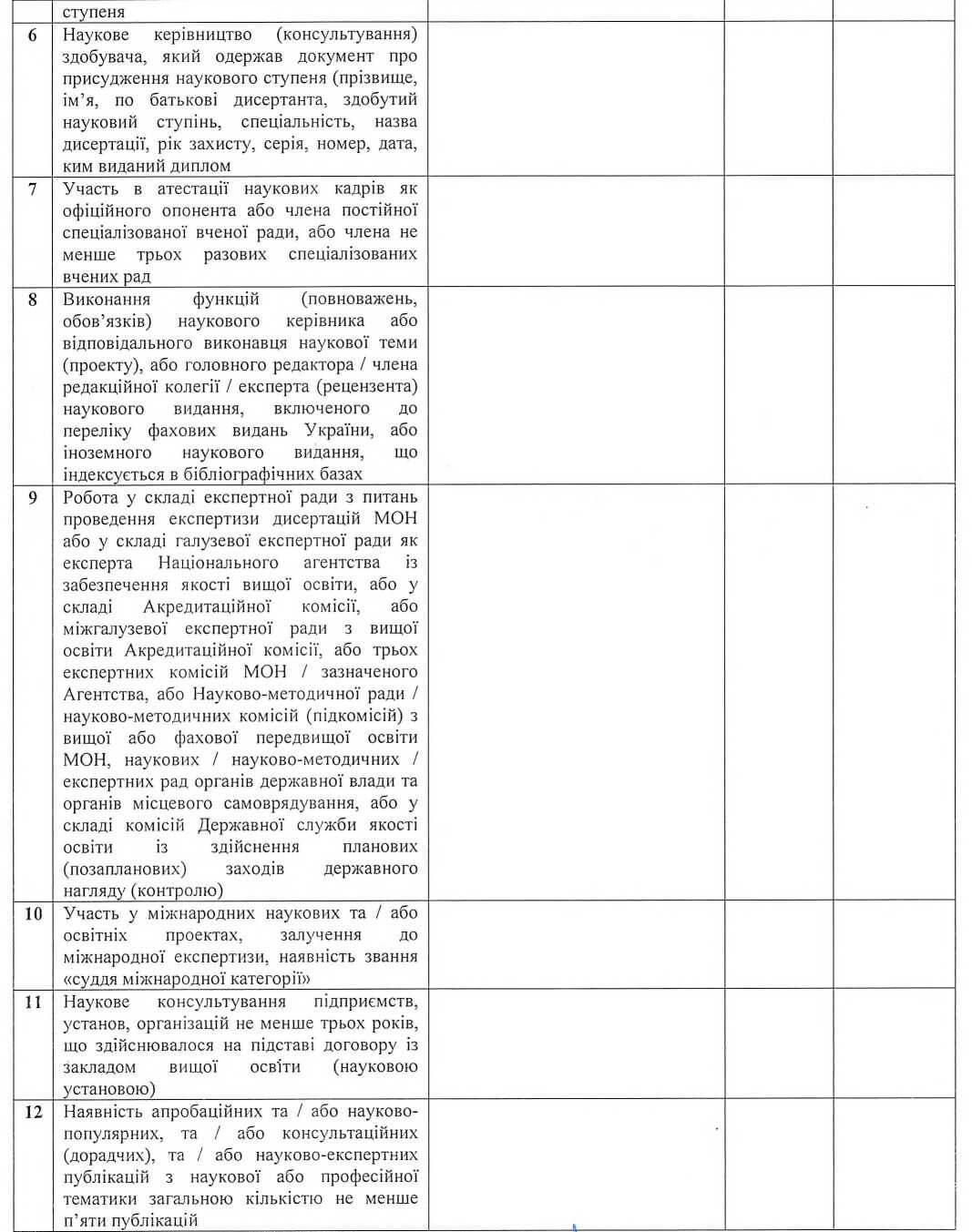 - наявність необхідної кількості досягнень у професійній діяльності за останні п’ять років, що визначено Ліцензійними умовами та посадовою інструкцією;