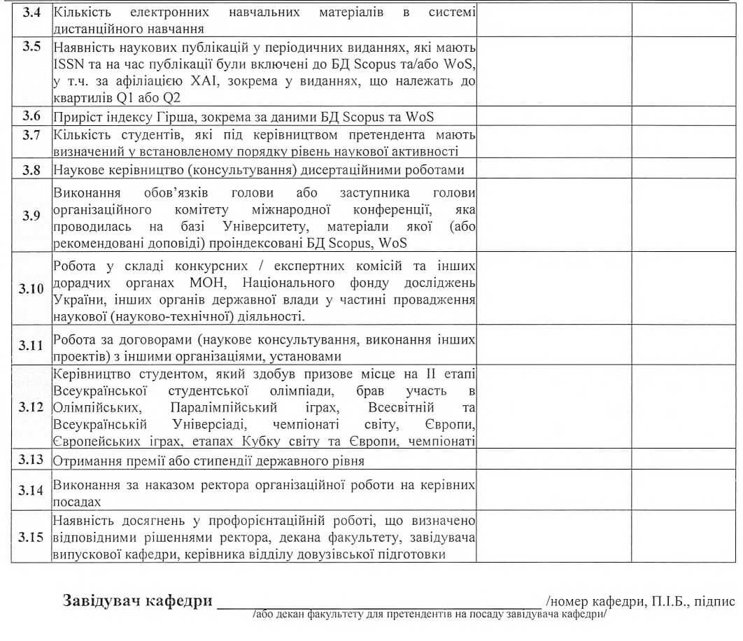 3) перелік досягнень у професійній діяльності претендента та інших показників на підставі підтверджуючих документів, засвідчений підписом завідувача кафедри / декана, а також оператора ЄДЕБО факультету (відповідно до додатку В);