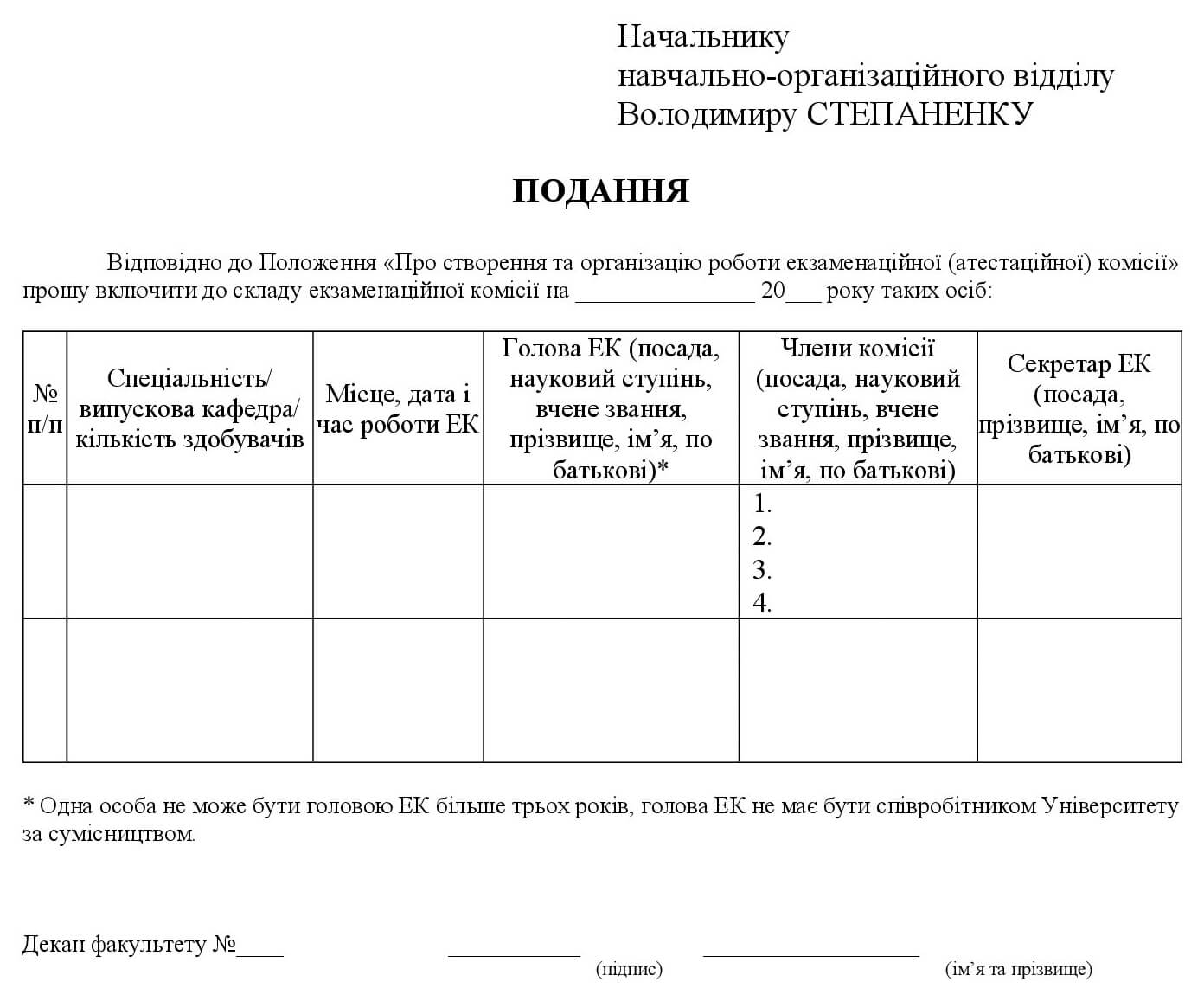 Форма подання декана факультету про персональний склад екзаменаційної комісії