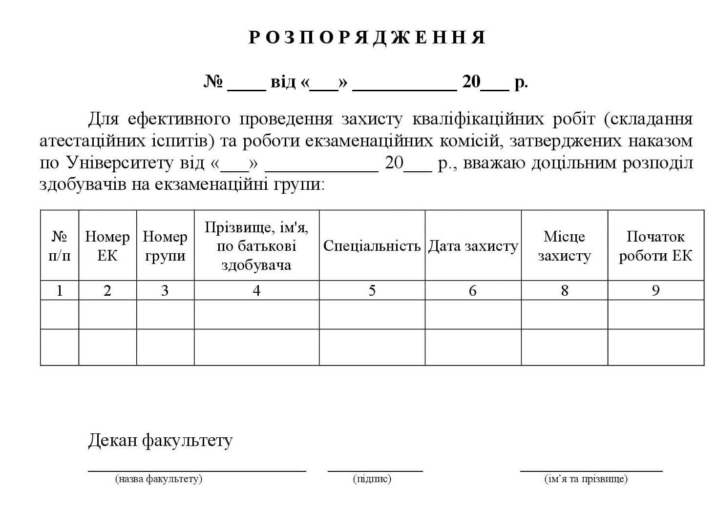 Форма розпорядження декана факультету на розподіл здобувачів, направлених на атестацію, на екзаменаційні групи