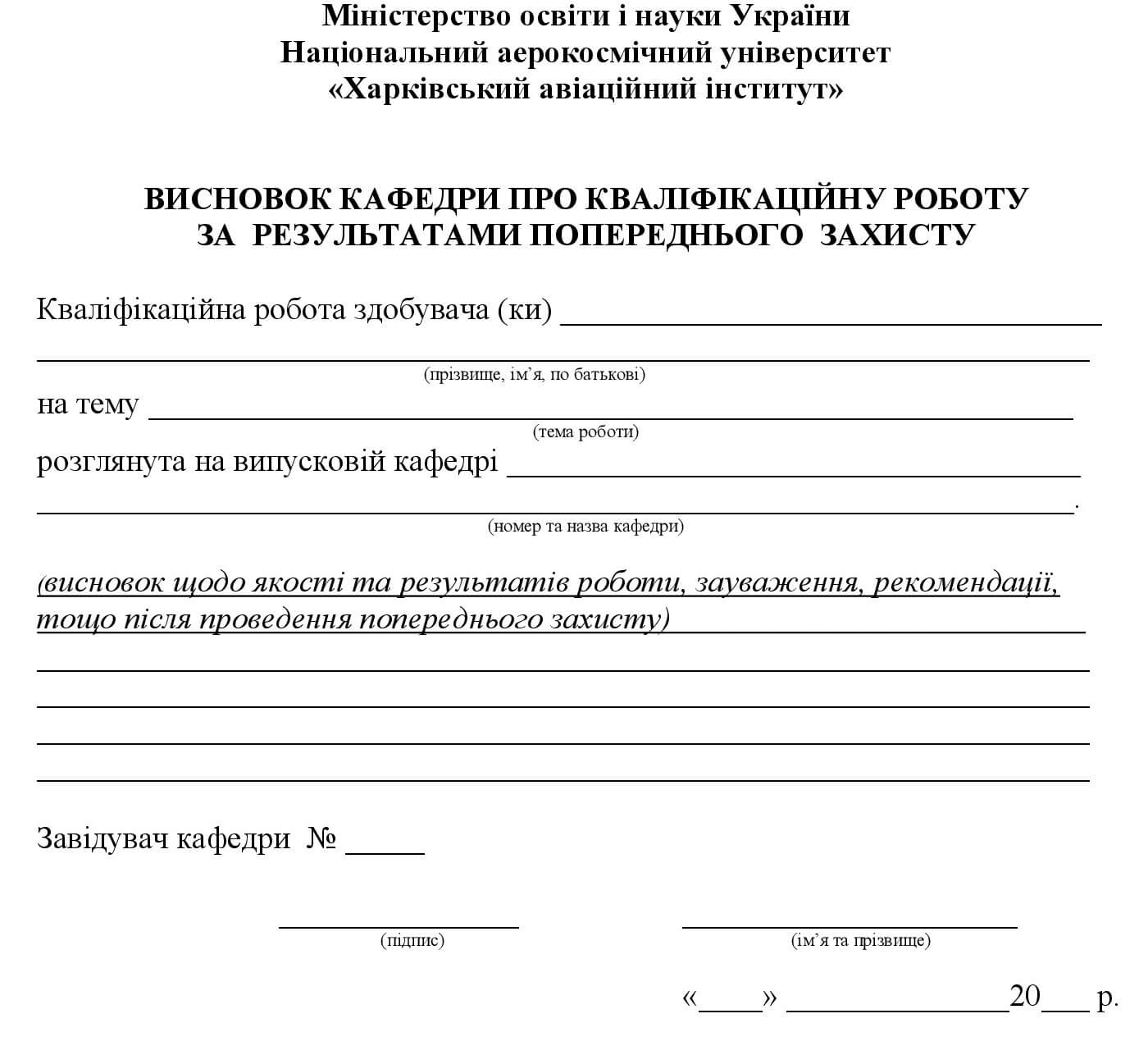 – висновки випускової кафедри за результатами попереднього захисту кваліфікаційної роботи на кафедрі;